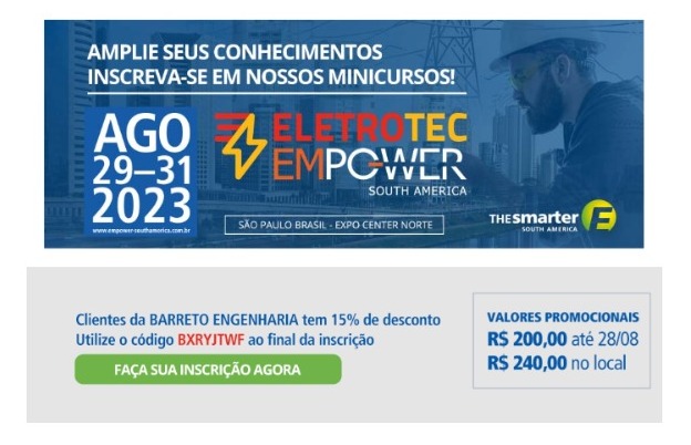 Venha participar da Expo Elétrica nos dias 15 e 16 de maio de 2023, no Centro de Convenções Frei Caneca.