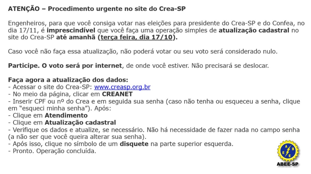 Engenheiros, para que você consiga votar nas eleições para presidente do Crea-SP e do Confea, no dia 17/11, é imprescindível que você faça uma operação simples de atualização cadastral no site do Crea-SP até amanhã (terça-feira, dia 17/10).